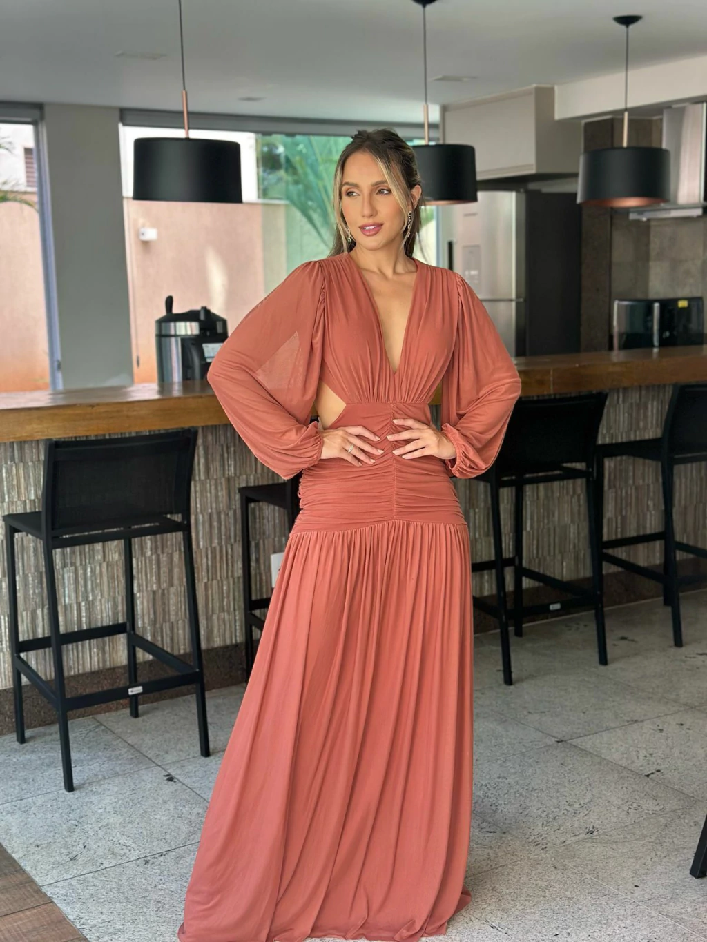 4. Saia Longa com Fenda Sutil: A saia longa do vestido apresenta uma fenda sutil, conferindo movimento e um toque de ousadia à peça.